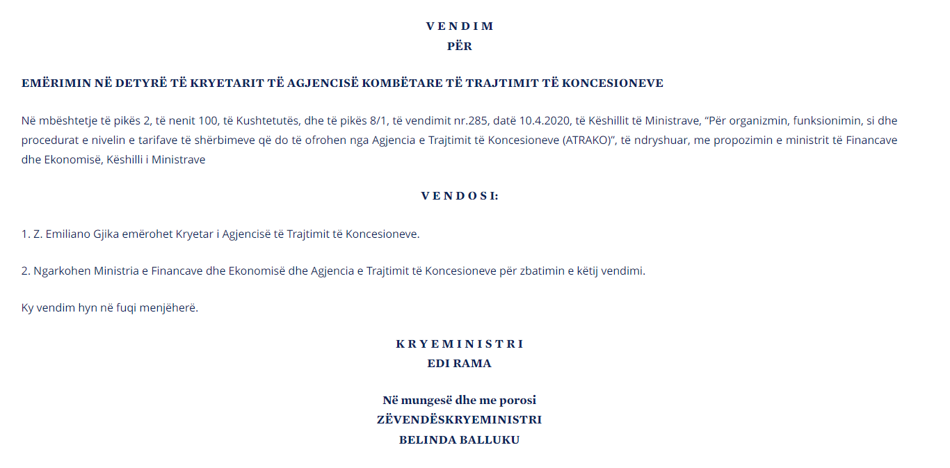 “Emiliano Gjika emërohet Kryetar i Agjencisë të Trajtimit të Koncesioneve.