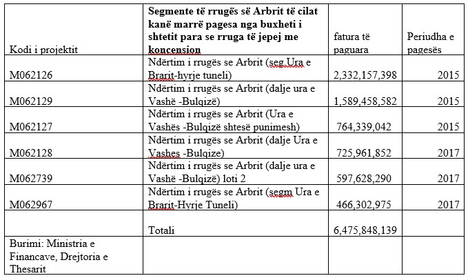 Para se të jepej me koncesion qeveritë ndër vite kanë paguar rreth 6,5 miliardë lekë ose 53 milionë euro fatura për ndërtimin e disa segmenteve në rrugën e Arbrit.