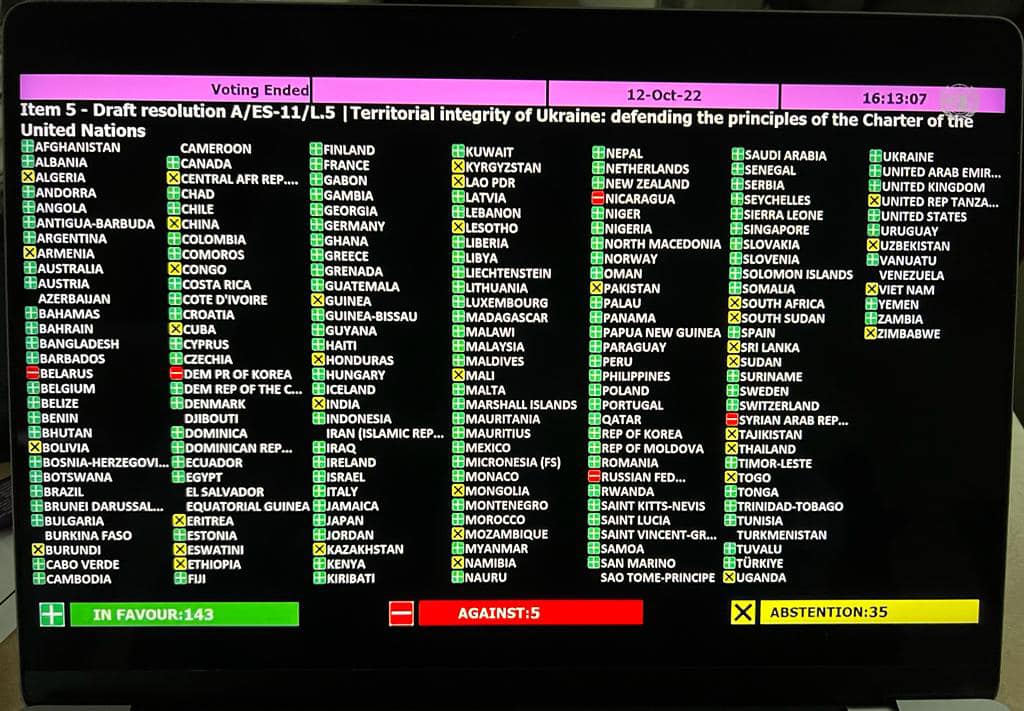 143 shtete votuan pro rezolutës, 5 kundër dhe 35 abstenuan mes tyre Kina dhe India .