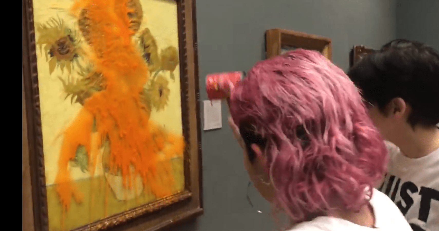Policia Metropolitane e Londrës arrestoi të premten dy eko-aktiviste pasi hodhën supë me domate mbi pikturën ikonike të Vincent van Gogh ‘Sunflowers’ (Lulet e diellit) në Galerinë Kombëtare të Londrës.