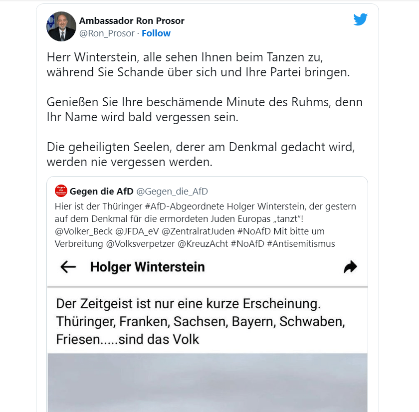 “Z. Winterstein, të gjithë po të shikojnë duke kërcyer ndërkohë që ti i shkakton turp vetes dhe partisë tënde.” – tha ambasadori Ron Prosor të hënën në një postim në Twitter.
