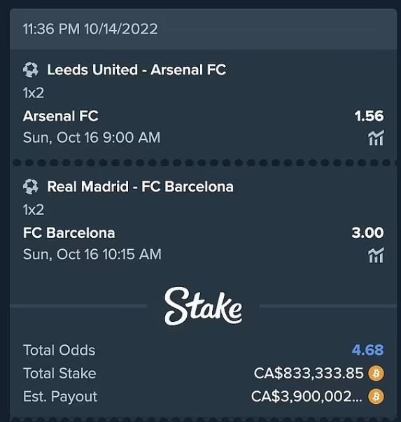 Basti i Drake, ishte që të dy skuadrat Arsenali dhe Barcelona do të fitonin ndeshjet e tyre përkatëse të dielën. Pjesa e parë e bastit u realizua, Arsenali fitoi përballë Leeds.