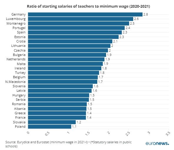 Me fjalë të tjera, paga fillestare e mësuesve në Poloni është shumë pranë nivelit të pagës minimale, ndërsa mësuesit që fillojnë punë në shkollat shtetërore gjermane fitojnë sa gati trefishi i pagës minimale.