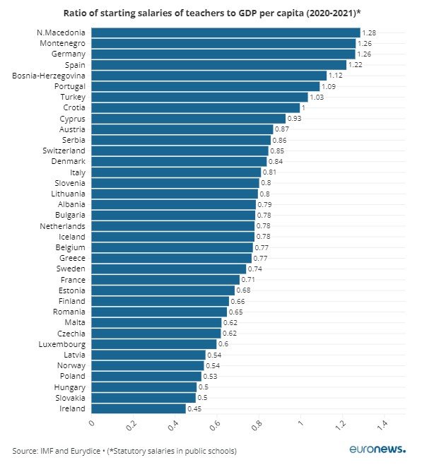 Në shumicën e vendeve europiane, mësuesit që fillojnë të punojnë në shkollat shtetërore fitojnë, mesatarisht, shumë më pak sesa produkti i brendshëm bruto kombëtar (PBB) për frymë.