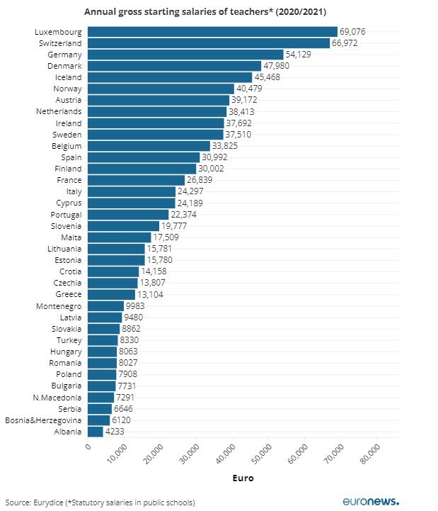 Pagat zyrtare vjetore bruto për mësuesit që sapo fillojnë punë në shkollat publike në arsimin e mesëm të ulët (ISCED 2) variojnë nga rreth 4,233 € në Shqipëri në 69,076 € në Luksemburg për vitet 2020-2021, sipas të dhënave për secilin vend, të përpiluara nga Komisioni Europian / EACEA / Eurydice.