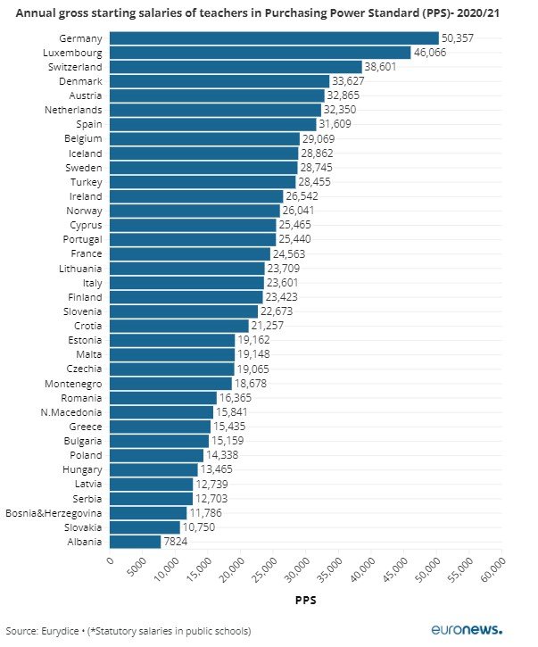 Vendet e Ballkanit si Mali i Zi dhe Maqedonia e Veriut, të cilat nuk janë pjesë e BE-së, kanë paga më të larta për mësuesit krahasuar me disa vende të BE-së, sipas matësit PPS. Çuditërisht, Turqia renditet dukshëm më mirë sipas indakitorit të PPS (28,455) sesa sipas pagës nominale (8,330 €). Ajo u rendit e 28-ta nga 36 vende sipas shifrave nominale, por zuri vendin e 11-të sipas PPS.