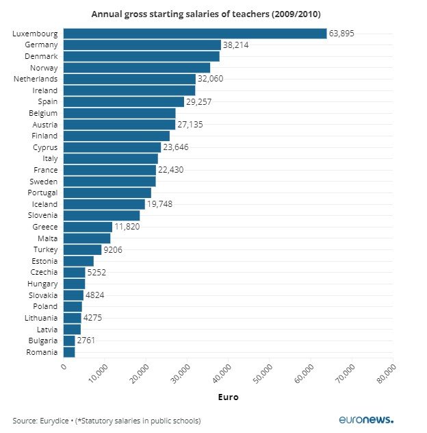 Bullgaria kishte pagat më të ulëta vjetore të mësuesve ndër të gjitha vendet e BE-së, me 7,731 euro. Pagat e mësuesve janë gjithashtu nën shifrën 10,000 euro edhe në disa vende të tjera të BE-së, si për shembull Letonia, Sllovakia, Hungaria, Rumania dhe Polonia.