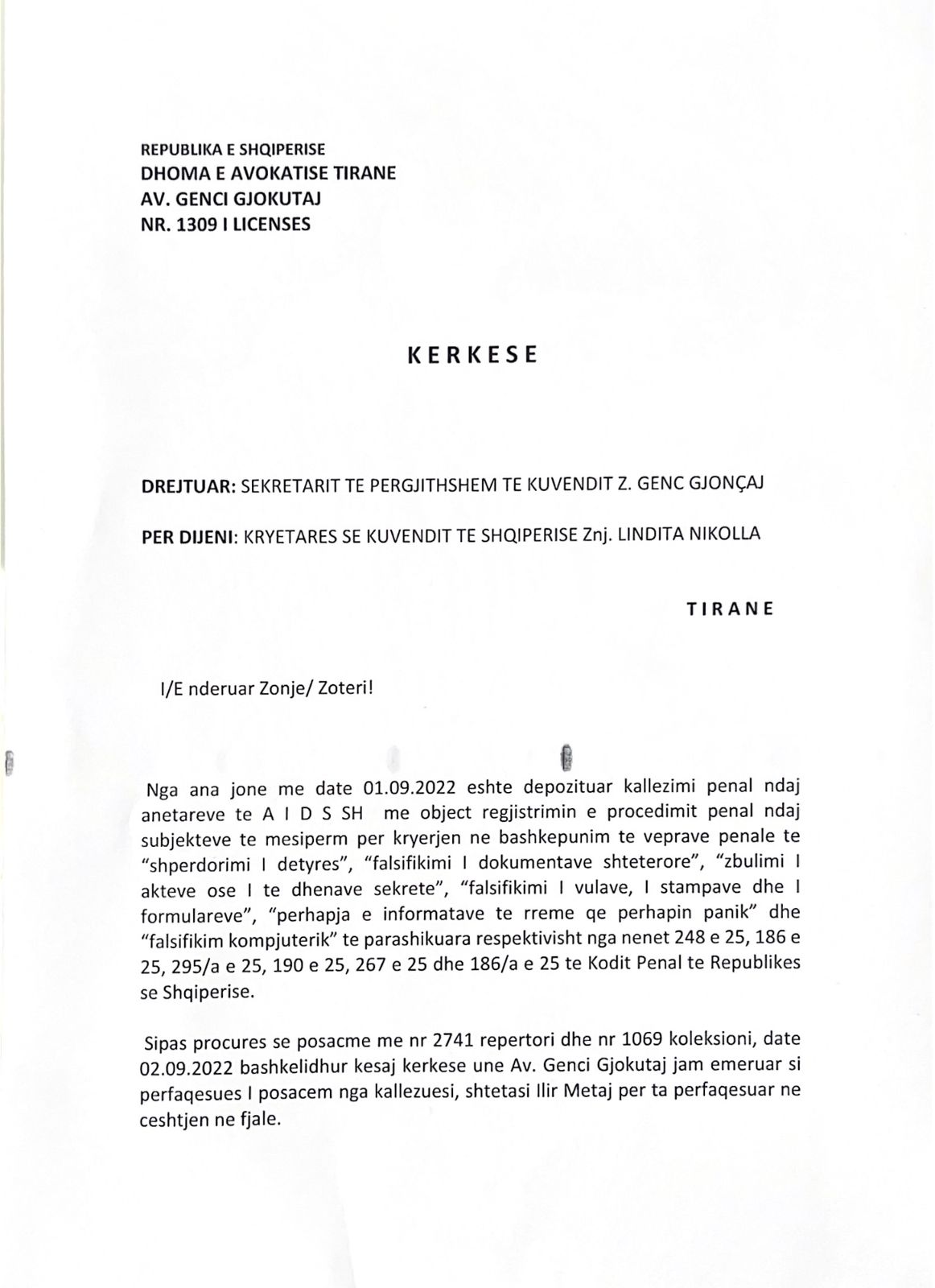 “Avokatit nuk iu është dhënë informacioni. Ndërkohë që ai ka të drejtë ligjore të njihet me të gjitha hapat, kur ka ardhur informacioni, kur ka hyrë, çfarë është diskutuar në Konferencën e kryetarëve, protokolli, me çfarë dokumentesh është punuar se me datën 26 dokumentet nuk ishin deklasifikuar, ishin sekret. Janë shkelje njëra më e tmerrshme se tjetra. Por bllokimi i informacionit, veprimi i këtij grupi me regji është provë asgjësuese e një faji i cili nuk mund të fshihet, manipulohet dhe s’mund t’i shpëtojë hetimit, pavarësisht nga qëndrimi si pjesë e grupit për fat të keq i Prokurorisë që ka vendosur të mos fillojë hetimet. Kjo rëndon Prokurorinë, por as nuk e fsheh dhe as nuk e mohon dot të vërtetën e shkeljeve shumë të rënda ligjore që konsumuan të gjithë me radhë nga Autoriteti deri tek Kuvendi, i cili është bërë pjesë totale e këtij grupi që vepron për qëllim politike, shantazhi për të goditur jo vetëm Ilir Metën, dështoi pa filluar, por për të goditur pluralizmin.