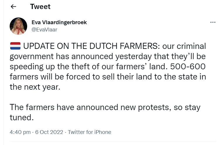 “Qeveria jonë kriminale ka njoftuar se do përshpejtojë vjedhjen e tokës së fermerëve tanë. 500-600 fermerë do detyrohen t’ia shesin tokën shtetit në vitin e ardhshëm. Fermerët kanë paralajmëruar protesta të reja, kështu që qëndroni me veshët e ngritur.” – shkroi Eva Vlaardingerbroek në Twitter.