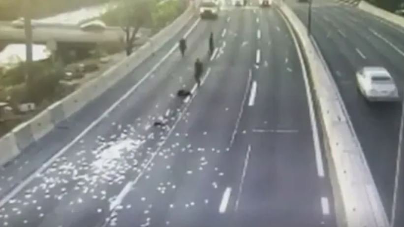 A violent robbery at a store ended in a police car chase, money raining down on a highway and six suspects getting arrested in Santiago, Chile#chile #santiago #chase #anews pic.twitter.com/KeHtPTQugh