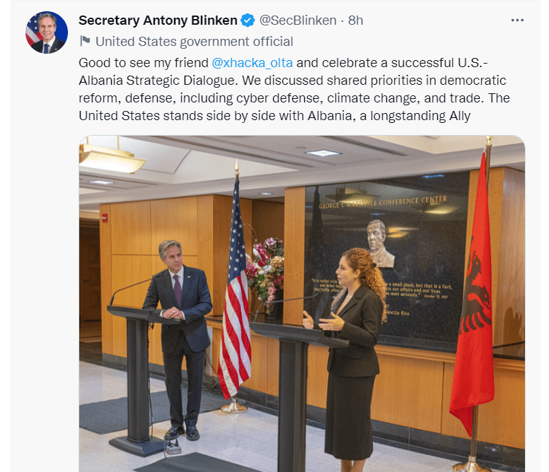 “Ishte kënaqësi të takoja miken time Olta Xhaçka dhe të festonim suksesin e Dialogut Strategjik SHBA-Shqipëri. Biseduam për prioritetet e përbashkëta në reformën demokratike, mbrojtjen, përfshirë edhe mbrojtjen kibernetike, ndryshimet klimatike dhe tregtinë. Shtetet e Bashkuara qëndrojnë krah për krah me Shqipërinë, aleate prej shumë kohësh.” – shkruan Blinken.