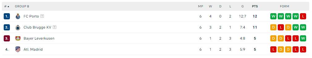 Kështu nga grupi B të kualifikuara për në sfidat me eliminim direkt janë Porto që renditet e para me 12 pikë dhe në vendin e dytë Club Bruge me 11 pikë.