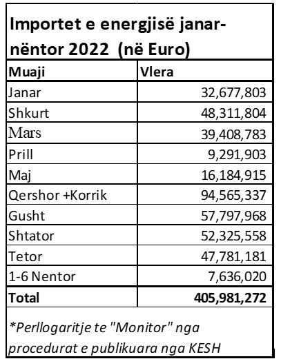 Sigurimi i sasisë së nevojshme të energjisë për të furnizuar vendin gjatë këtij viti i ka kushtuar qeverisë qindra milionë euro. Të dhënat zyrtare të procedurave të prokurimit të publikuara nga KESH dhe të përpunuara nga “Monitor” për periudhën 1 Janar-6 nëntor tregojnë se totali i importeve ka prekur vlerën 406 milionë euro.