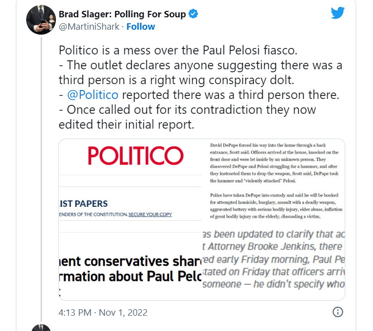 Ndërkohë një tjetër media, Politico, fillimisht raportoi se një person i tretë ishte në shtëpi dhe se ky person i tretë i hapi derën policisë. Pastaj Politico e tërhoqi raportin dhe kritikoi ata që besuan raportin e tyre fillestar se po ‘përhapnin dezinformata’.