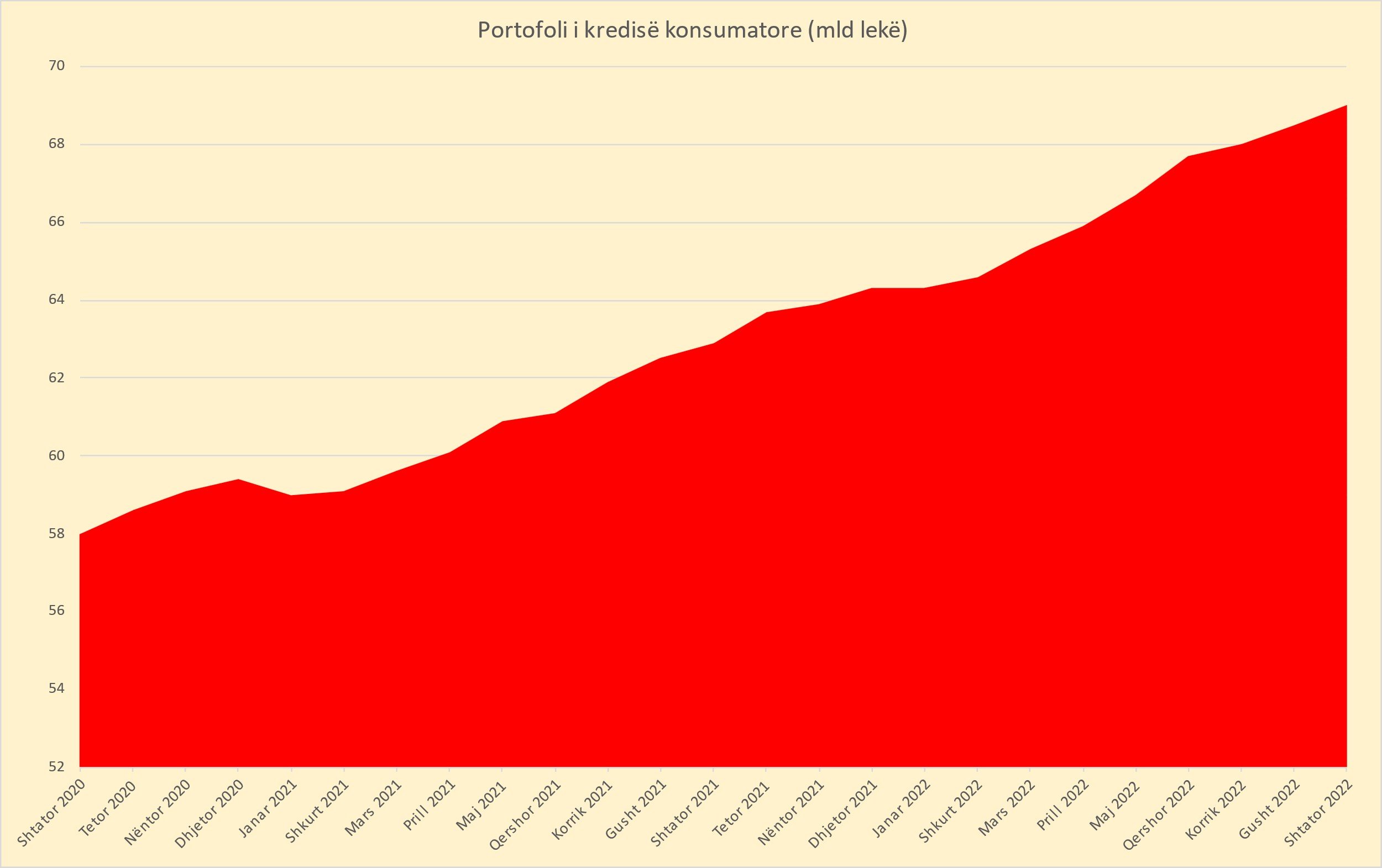 Kredia konsumatore e dhënë nga sektori bankar shqiptar po vijon rritjen edhe gjatë këtij viti. Të dhënat e Bankës së Shqipërisë tregojnë se në fund të muajit shtator vlera totale e portofolit të kredisë konsumatore, duke përfshirë edhe overdraftet, arriti në pothuajse 69 miliardë lekë ose rreth 590 milionë euro, në rritje me 9.6% krahasuar me të njëjtën periudhë të një viti më parë.