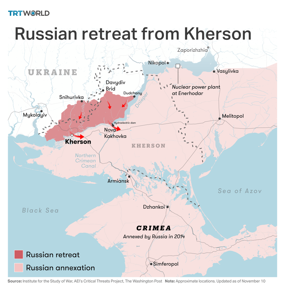 Por ditët e fundit, forcat ruse janë tërheur ngadalë nga pozicionet e tyre në qendër të qytetit Kherson, që ndodhet në bregun perëndimor të lumit në Kherson, duke i detyruar analistët ushtarakë të futen në një lojë hamendësimi për qëllimet e vërteta të Rusisë. Kherson, një rajon strategjik, formon një urë tokësore midis gadishullit të Krimesë të pushtuar nga Rusia dhe kontinentit rus.