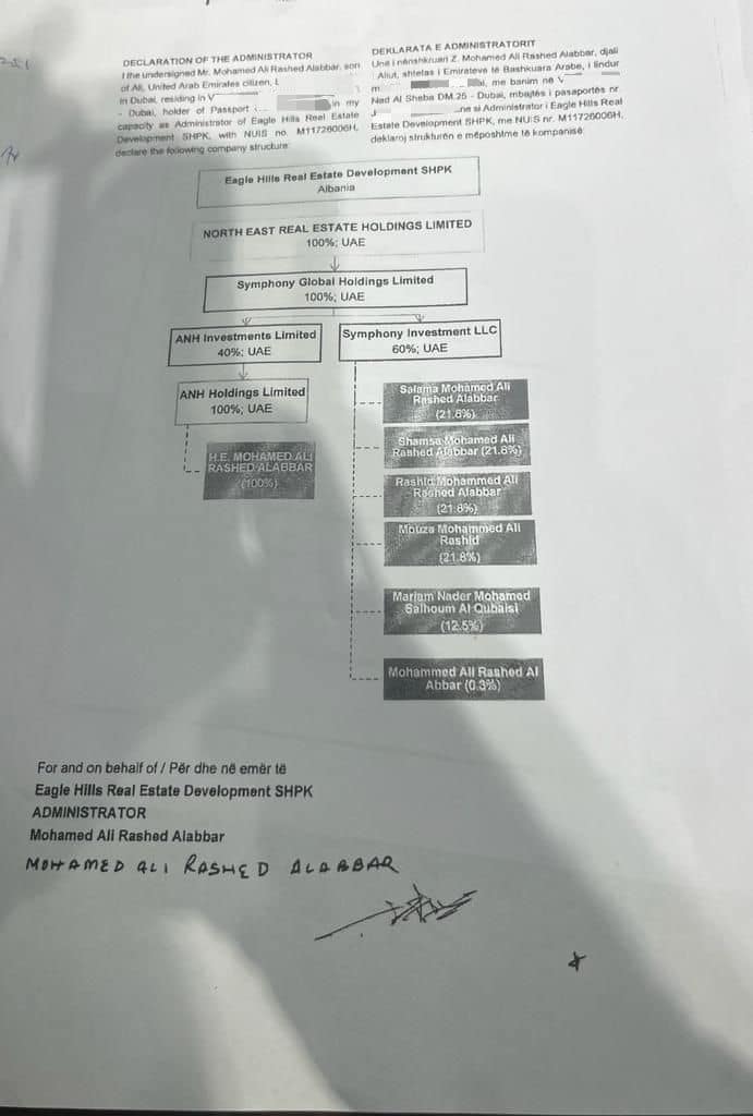 Sipas dokumentit të publikuar nga deputeti përfituesi fundor rezulton Muhamed Alabbar dhe familja e tij