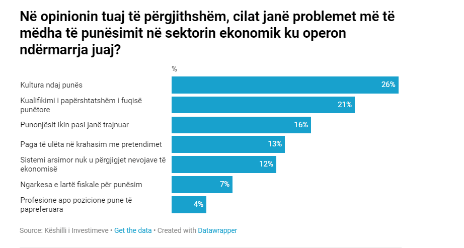 Sipas sondazhit, 26% e sipërmarrësve rendisin si problematikën më shqetësuese sa i përket punonjësve, kulturën e punës, çka për drejtuesit nënkupton përgjegjshmëri, korrektësi dhe komunikimin ndaj vendit të punës. Si faktorin e dytë më të rëndësishëm, 21% e sipërmarrësve rendisin kualifikimim e papërshtatshëm të fuqisë punëtore. Ndërkohë që 16% e tyre shprehen se punonjësit iu largohen fill pasi marrin trajnimet e duhura pranë kompanive të tyre.