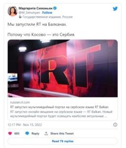 Dhe, kur pritej që me zgjedhjen e qeverisë së re të presidentit serb Vuçiç, ky i fundit të heq dorë nga ndeja në dy karrige, kur pritej harmonizimi i politikës së vendit të tij me atë të Bashkimit Evropian dhe të Shteteve të Bashkuara të Amerikës, të martën e kaluar me “amin”-in serb kanali shtetëror rus “Russia Today”(RT) nisi transmetimet online, në serbisht! Lajmi në Twitter u bë i ditur nga kryeredaktorja e “Russia Today” Margarita Simonjan. Arsyetimi dhe mesazhi i saj ishte i shkurtër dhe tepër i qartë “Nisëm RT-në në Ballkan. Sepse Kosova është Serbi”! Kaq ka shkruar Simonjan për ta kuptuar të gjithë.