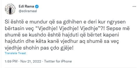 “Si është e mundur që sa gdhihen e deri kur ngrysen bërtasin veç ‘Vjedhje! Vjedhje! Vjedhje’?! Sepse më shumë se kushdo është hajduti që bërtet kapeni hajdutin dhe këta kanë vjedhur aq shumë sa veç vjedhje shohin pas çdo gjëje!”– shkruan Rama në “Twitter”.