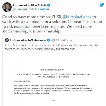 “Mirë që kemi më tepër kohë për të punuar me palët e interesuar për gjetjen e zgjidhjes. E përsëris, është absurde të rrezikohet përshkallëzimi për targat. Na duhen më shumë burra shteti dhe jo ata që e rrezikojnë.”– deklaroi Rohde.
