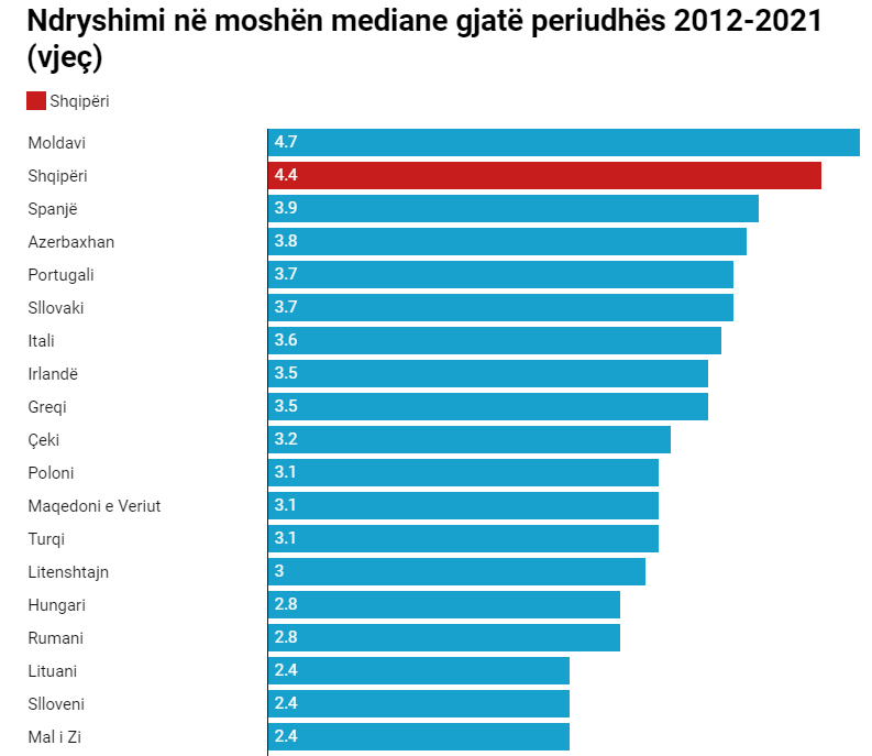 Ndërkohë, vendet e Bashkimit Europian janë plakur mesatarisht 2.2 vite gjatë periudhës 2012-2021, referuar Eurostat.