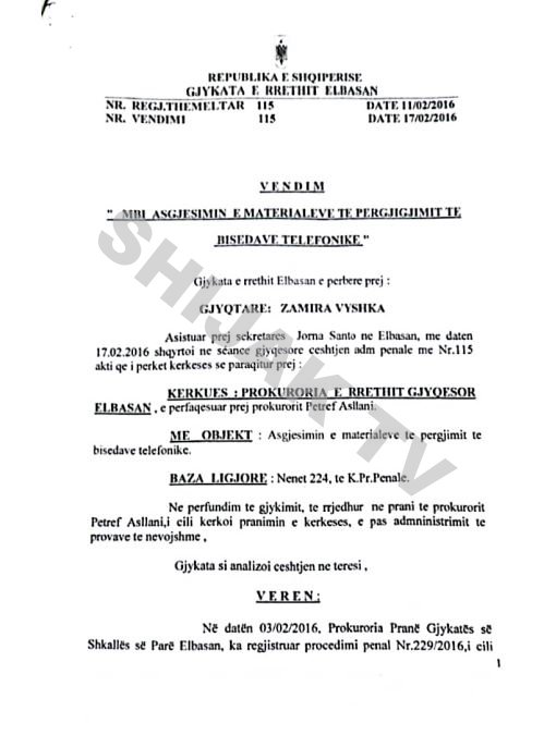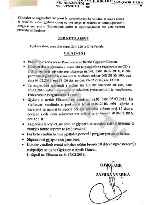 -Gjykata e rrethit Elbasan me vendimin nr 88 datë 05/02/2016 ka vlerësuar vendimin e prokurorit të datës 04/02/2016 mbi lejimin e përgjimit të numrit të mësipërm për një periudhë kohorë prej 15 ditësh, përgjim I cili është ndërprerë me urdhër të prokurorit dt 06/02/2016 ora 12:10