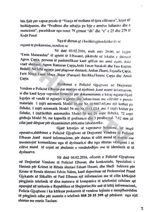 Me datë 03/02/2016, Prokuroria pranë Gjykatës së Shkallës së parë Elbasan, ka regjistruar procedimin penal nr. 229 i cili bën fjalë për vepra penale të “vrasje në rrethana të tjetra cilësuese” kryer në bashkëpunim dhe “prodhim dhe mbajtje pa leje e armëve luftarake dhe e municionit” parashikuar nga nenet 79 germa “dh” dhe “e” e 25 dhe 278 të Kodit Penal