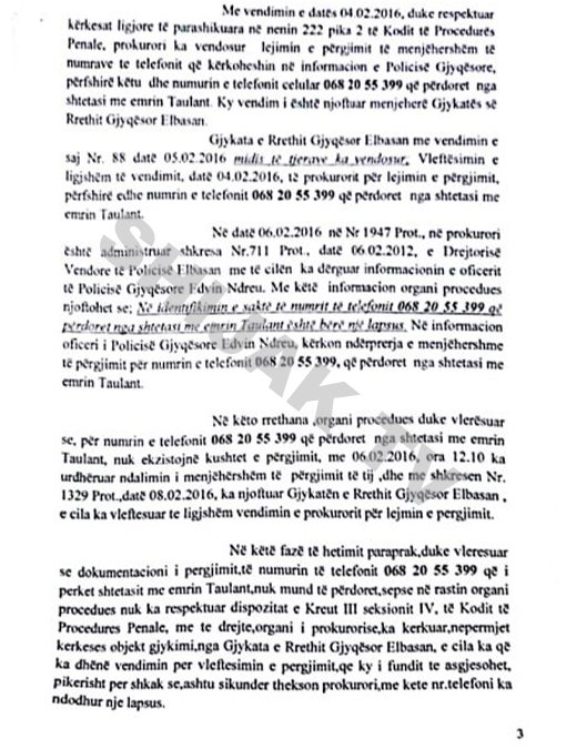 Gjykata e Rrethit Gjyqësor Elbasan me vendimin e saj Nr 88 datë 05/02/2016 ndër të tjera ka vendosur. Vlerësimin e ligjshëm të vendimit datë 04/02/2016 të prokurorit për lejimin e përgjimit, përfshirë edhe numrin e telefonit 0682055399 që përdoret nga shtetasi me emrin Taulant.