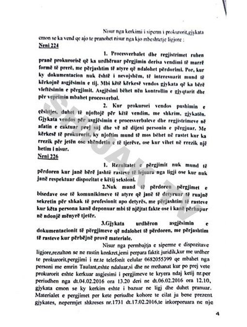 Me vendimin e datës 04/02/2016 duke respektuar kërkesat ligjore të parashikuara në nenin 222 pika 2 të Kodit të Procedurës Penale, Prokurori ka vendosur lejimin e përgjimit të menjëhershëm të numrave të telefonit që kërkoheshin në informacionin e Policisë Gjyqësore përfshirë këtu edhe numrin e telefonit celular 0682055399 që përdoret nga shtetasi me emrin Taulant. Ky vendim I është njoftuar menjëherë Gjykatës së Rrethit Gjyqësor Elbasan.