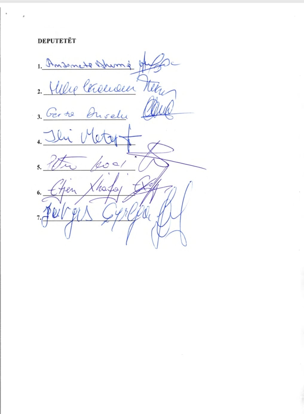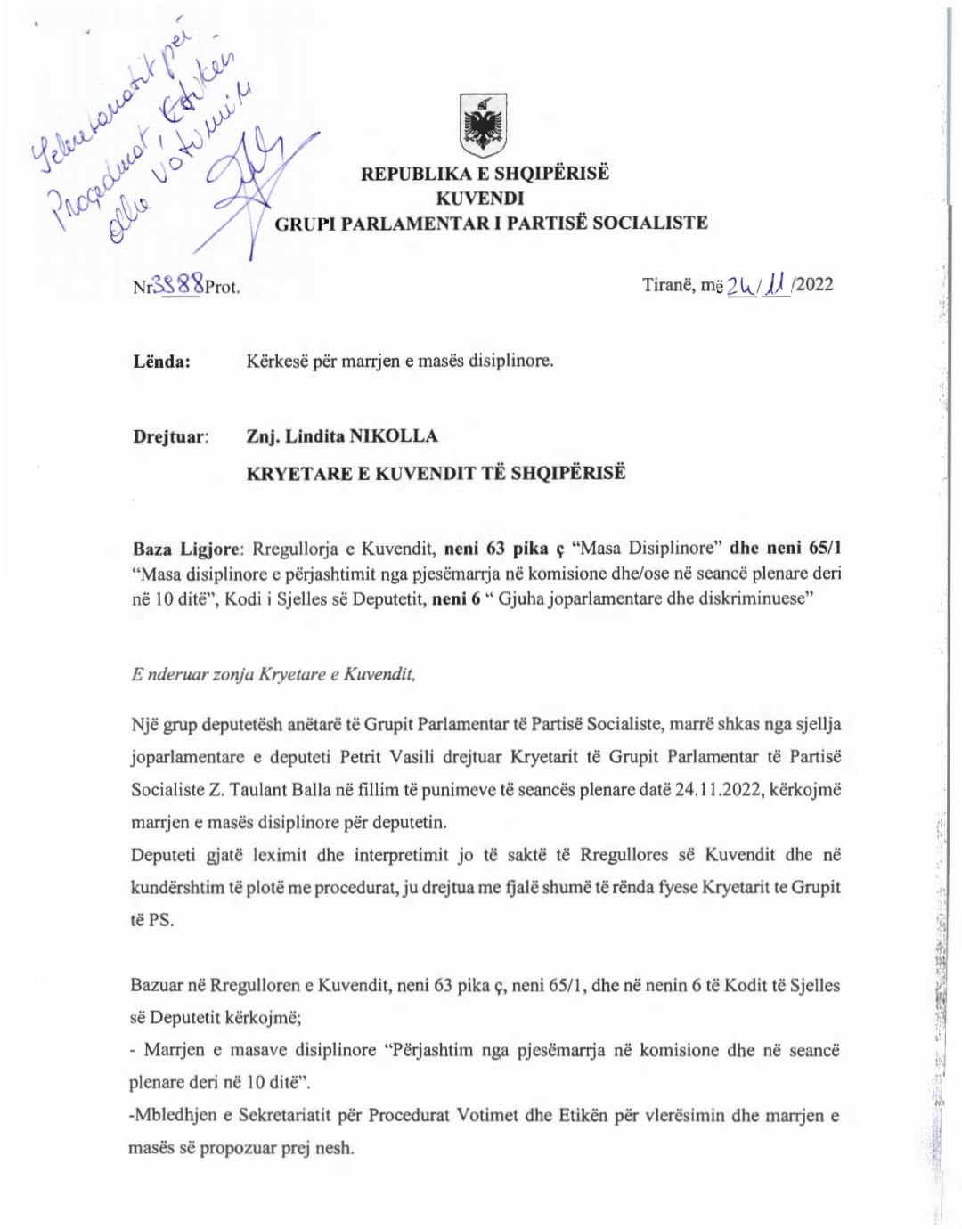 Kërkesa për përjashtimin e Vasilit me 10 ditë është firmosur nga 7 deputetët e PS-së, Etjen Xhafaj, Antoneta Dhima, Petro Koçi, Gerta Bardeli, Ilir Metaj, Jurgis Çyrbja dhe Milva Ikonomi.