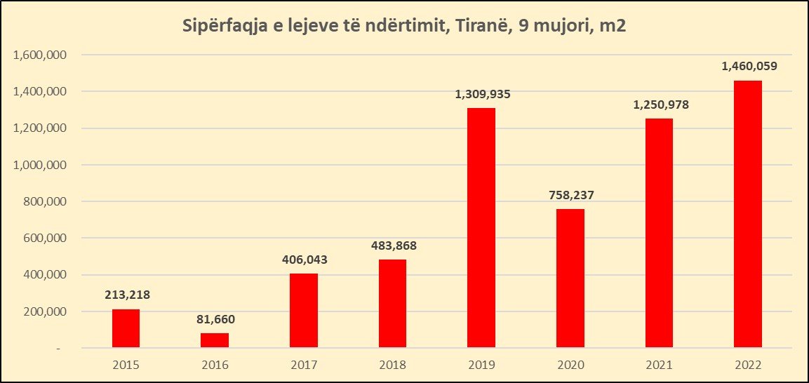 Ky është niveli më i lartë i lejeve i dhënë ndonjëherë për kryeqytetit, të paktën që nga viti 2002, kur INSTAT raporton sipërfaqen e lejeve të dhëna sipas qarqeve.