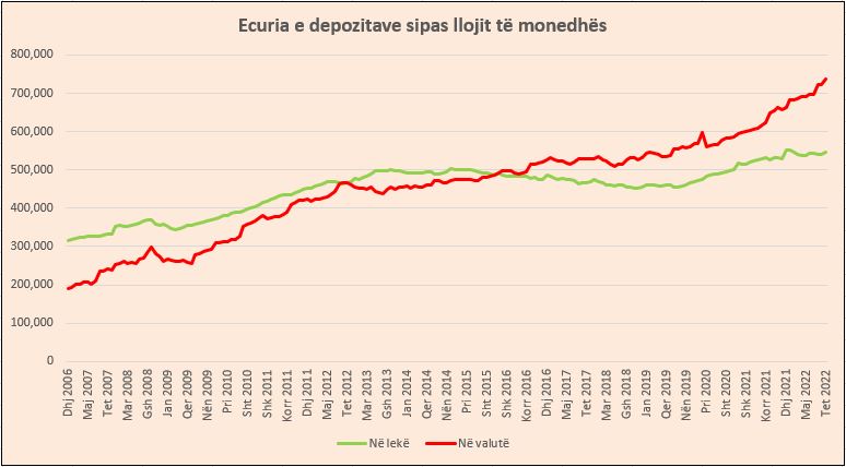 Si rrjedhojë e rritjes më të shpejtë të depozitave në euro në raport me ato në lekë, është rritur pesha e kursimeve në valutë, që arriti në një rekord të ri prej 57.45% në tetor 2022, nga 55.46, që ishte në të njëjtin muaj të një viti më parë.