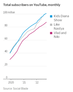 Fëmijët janë yje të tre kanaleve në YouTube: ‘Vlad dhe Niki’, ‘Like Nastya’ dhe ‘Kids Diana Show’. Këto janë tre kanalet më të njohura të YouTube për fëmijë me veprim të drejtpërdrejtë në botë, me afro 300 milionë abonentë në YouTube mes tyre. Tani ata po zgjerohen në gjithçka, nga transmetimi i shfaqjeve e te lodrat e markave të njohura, deri te marrëveshjet e licencimit, të gjitha me vlerë dhjetëra miliona dollarë.