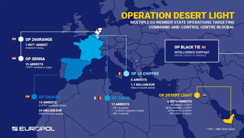 Europol njofton se mes datave 8-19 Nëntor, u kryen bastisje të koordinuara në të gjithë Evropën dhe Emiratet e Bashkuara Arabe (EBA), duke synuar si qendrën e komandës dhe kontrollit ashtu edhe infrastrukturën logjistike të trafikut të drogës në Evropë.