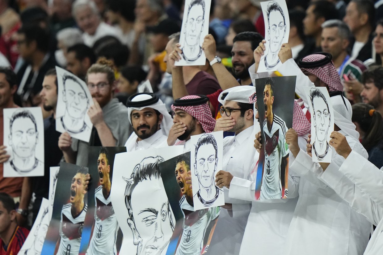 Tifozët e futbollit në Katar u ‘tallën’ me Gjermaninë në ndeshjen kundër Spanjës, të dielën mbrëma, duke u parë duke mbuluar gojën dhe duke tundur postera të fituesit të Kupës së Botës Mesut Ozil.