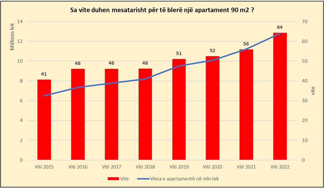 Një apartament me sipërfaqe 90 m2 i kushton sot “një tiranasi” mesatarisht 12,7 milion lekë, pa përshirë këtu asnjë kosto shoqëruese si mobilim, sigurim i pronës apo taksa mbi pasuritë e paluajtshme etj. Një individ me pagë mesatare do të duhet të punojë 64 vjet sot që të blejë një shtëpi (duke supozuar që 30% të të ardhurave shkojnë për marrjen e një kredie dhe 70%).