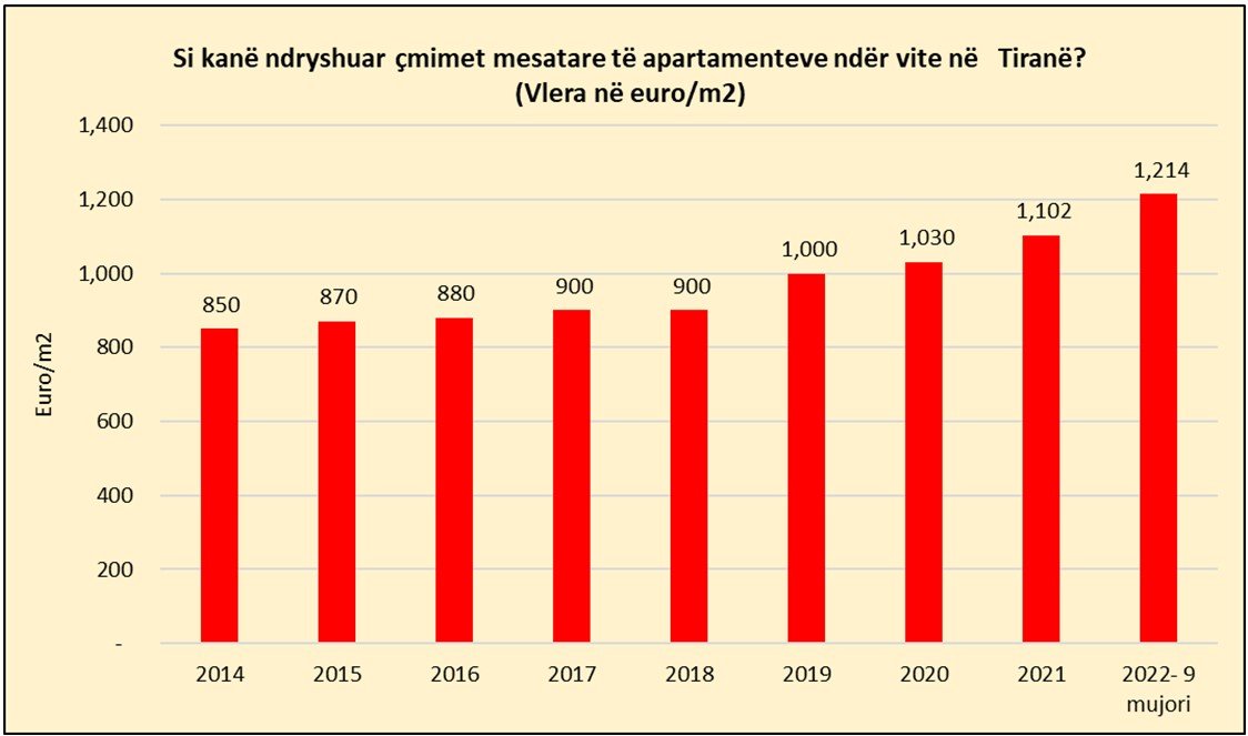 Sipas Indeksit të Pronave publikuar së fundmi nga Keydata Albania, një njësi e “Çelësi Media Group”, rezulton se çmimi mesatar i një apartamenti në Tiranë është 1,214 euro/m2 në fund të 9 mujorit 2022, nga 870 euro/m2, që ishte në 2015-n, duke u shtrenjtuar me rreth 40%. Ylli Sula, CEO i “Çelësi media Group” pohon se në çmimin mesatar përfshihen si apartamentet e reja ashtu dhe ato të vjetra, ndërsa mesatarja e apartamenteve të reja është edhe më e lartë, pasi ndërtimet e reja janë shtrenjtuar me ritme më të larta.
