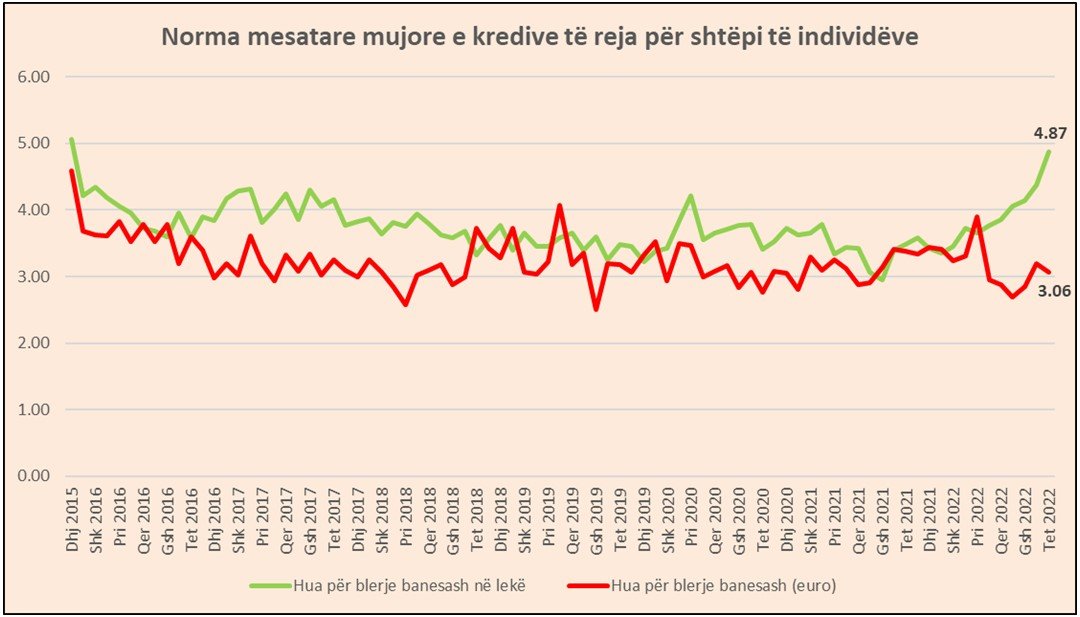 Ky është niveli më i lartë që nga dhjetori i vitit 2015. Shtrenjtimi i interesave të kredive reflekton politikën shtrënguese monetare që po ndjek Banka e Shqipërisë nga muaji mars i këtij viti, si një mjet për të luftuar inflacionin e lartë. Norma bazë e interesit është rritur nga 0.5% në 2.75% në harkun e shtatë muajve. Rritja e normës bazë nga Banka e Shqipërisë rrit çmimin e injektimit të parasë në sistem, duke e bërë paranë më të shtrenjtë (shiko grafikun: Ecuria e interesave të kredive).