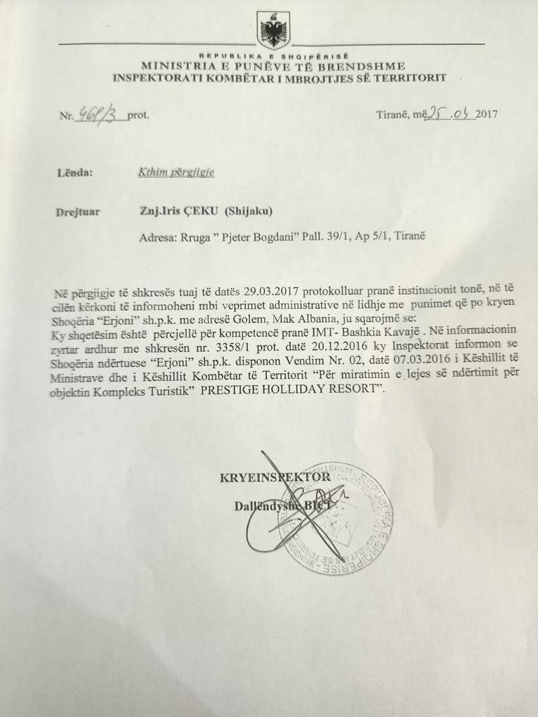 Mirëpo sipas kreut të PL-së Ilir Meta, shembja e resortit po bëhet në shkelje të çdo ligji. Madje ai ka publikuar dhe shkresën që vërteton se resorti ka leje ndërtimi.