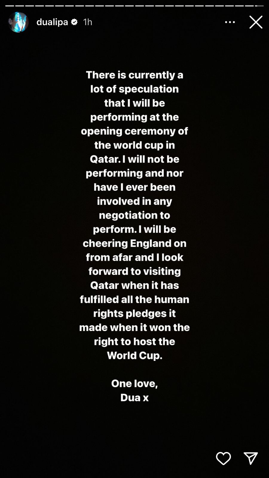 Dua shtoi se “Nuk kam asgjë kundër Katarit dhe shpresoj se një ditë do të kem mundësinë të shkoj atje. Por nuk më pëlqente të isha mes spekulimeve se do të performoja për diçka që bie në kundërshtim me bindjet e mia.”