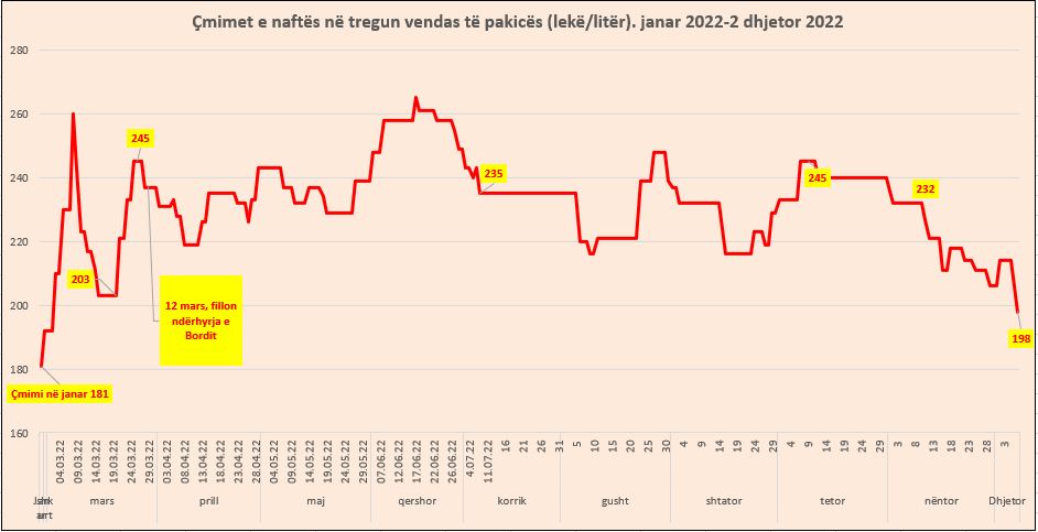 Nafta ka zbritur në 198 lekë, nga 206 lekë që ishte deri tani. Kjo është hera e parë që nafta ka zbritur nën 200 lekë, që nga fillimi i marsit, kur karburanti filloi të rritej me shpejtësi si rrjedhojë e sulmeve të Rusisë ndaj Ukrainës. Benzina do të tregtohet me 180 lekë, nga 184 lekë në vendimin e fundit.