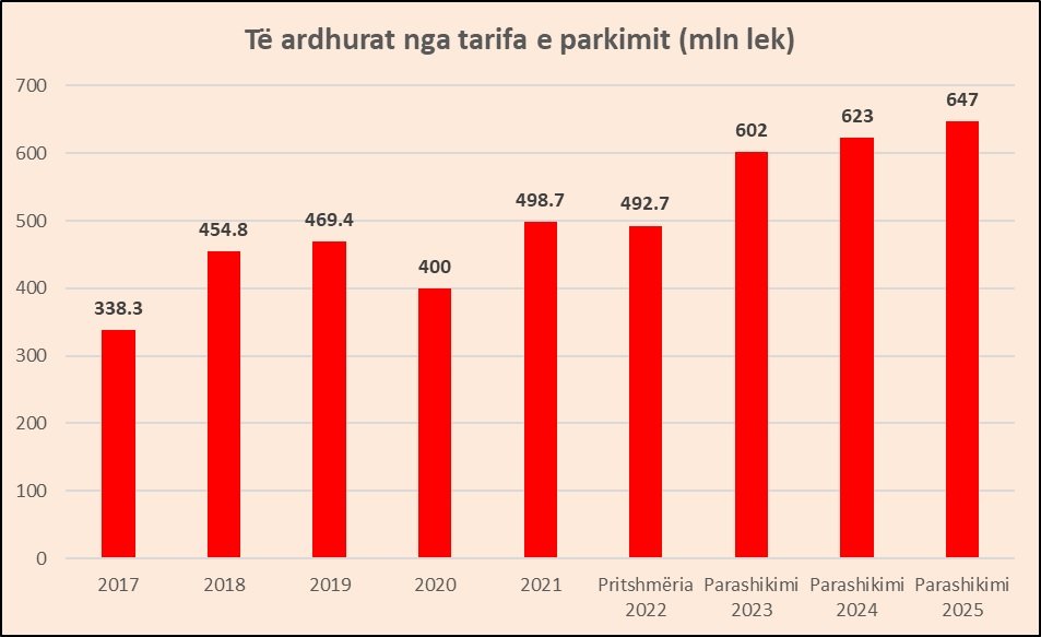 Në vitet në vazhdim, Bashkia pret që të mbledhë më shumë të ardhura nga tarifa e parkimit. Në 2023-n, përdoruesit e automjeteve pritet të paguajnë 602 milionë lekë (5.2 milionë euro). Në dy vitet në vijim të ardhurat e Bashkisë nga parkimi pritet të rriten më tej, në përkatësisht 623 milionë lekë në 2024-n dhe 647 milionë lekë në 2025-n.
