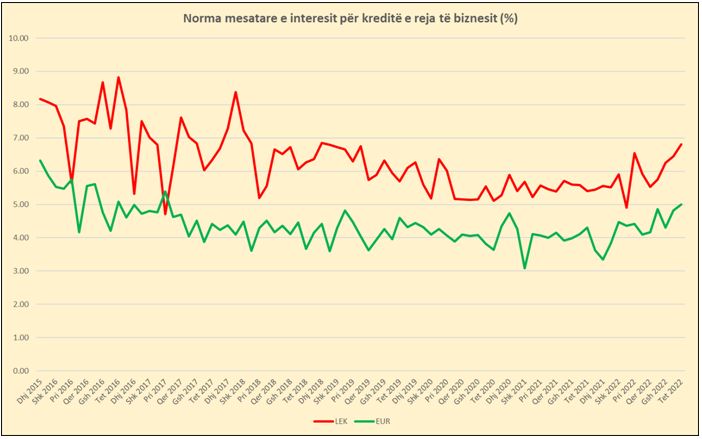 Në muajin tetor, norma mesatare e interesit për kreditë e reja të bizneseve në Lekë arriti në 6.81%, nga 5.41% që kishte qenë në të njëjtën periudhë të një viti më parë. Ky është njëkohësisht niveli më i lartë i regjistruar që prej fillimit të vitit 2019.