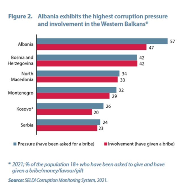 “Shqipëria duket të jetë vendi më i prekur nga korrupsioni administrativ më i lartë në rajon me 57% të qytetarëve që u kërkohet ryshfet të paktën herë pas here dhe 47% marrin pjesë realisht në transaksione korrupsioni”, thuhet në raport.