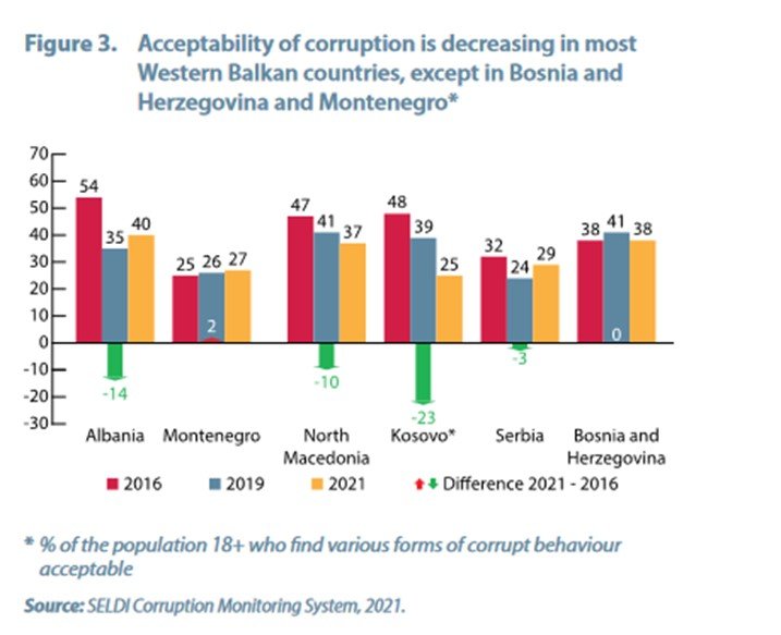 Megjithatë, rënia e vazhdueshme e pranueshmërisë në të gjitha vendet, përveç BiH dhe Malit të Zi që nga viti 2016, tregon rritjen e qëndrueshmërisë ndaj korrupsionit midis qytetarëve, thekson raporti.