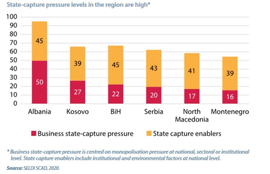 Treguesin e presionit për kapjen e shtetit nga bizneset, i cili përqendrohet në presionin e monopolizimit në nivel kombëtar, sektorial ose institucional, Shqipëria e ka 45, më e larta në rajon, së bashku me Bosnjë Hercegovinën. Ndërsa për indikatorin tjetër, mundësuesit e kapjes së shtetit, që përfshijnë faktorë institucionalë dhe mjedisorë në nivel kombëtar, arrin në 50, gati dy herë më i lartë sesa vendi i dytë pas nesh që është Kosova.