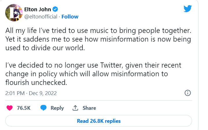 Ikona e popit Sir Elton John njoftoi të premten se po largohet nga Twitter duke përmendur shqetësimet për keqinformimin dhe drejtimin e platformës së mediave sociale nën pronarin e ri Elon Musk.