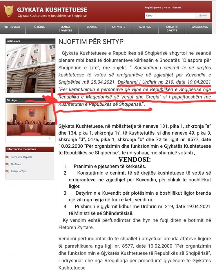 Ai shkruan se Gjykata Kushtetuese e ka cilësuar të papajtueshëm me Kushtetutën vendimin e Manastirliut për karantimin e personave që erdhën nga Greqia e Maqedonia e Veriut, duke penguar kësisoj dhjetëra mijëra emigrantë nga e drejta e votës.