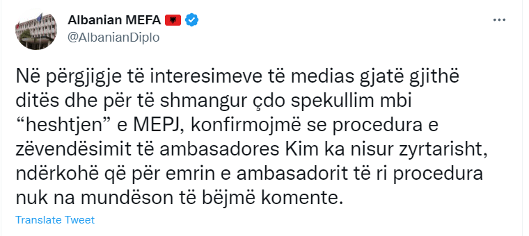 “Në përgjigje të interesimeve të medias gjatë gjithë ditës dhe për të shmangur çdo spekulim mbi ‘heshtjen’ e MEPJ, konfirmojmë se procedura e zëvendësimit të ambasadores Kim ka nisur zyrtarisht, ndërkohë që për emrin e ambasadorit të ri procedura nuk na mundëson të bëjmë komente.”- shkruan Ministria e Jashtme.